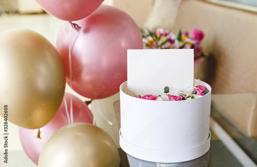 Flower Box With Blank Card Roses Flower Composition Gift Bouquet For Mothers Day Womens Day Birthday And Greeting Card Gift Card Inside With Empty Space For Your Design Logo Festive Balloons Stock Photo